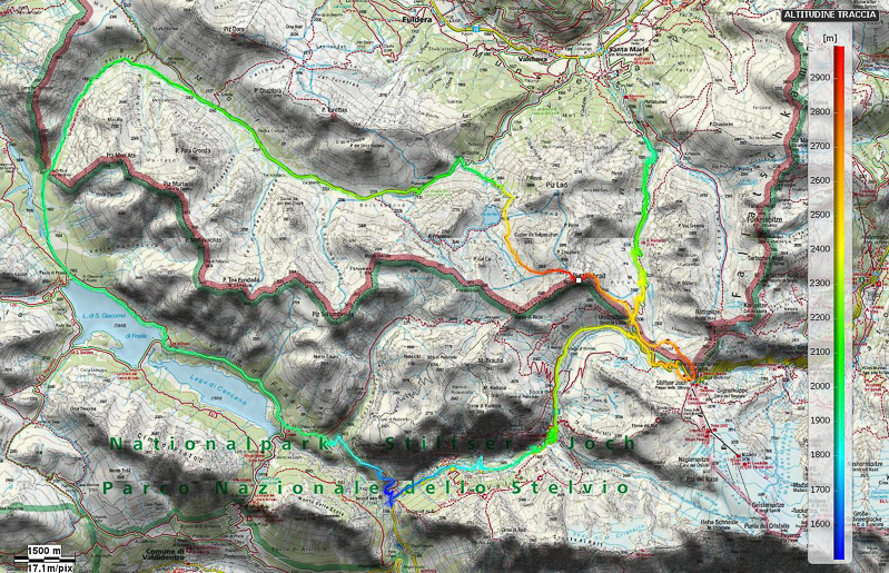 2015_0827_Strada passo Umbrail quota 1850, Umbrailpass, Piz Umbrail, Lago di Rims, Las Clastras, Strada del Vino e del sale, Doss Radond, La stretta, Passo di Val Mora, Passo di Fraele, Lago di San Giacomo, 175, Val di Fraele, Lago di Cancano, Solena, Grasso di Solena, 10, Strada dello Stelvio da Bormio quota 1550, Bocca del Braulio, M.ga di Bormio, Umbrail Pass, Passo dello Stelvio, Rif. Garibaldi, sentiero, Umbrail Pass, rientro su asfalto